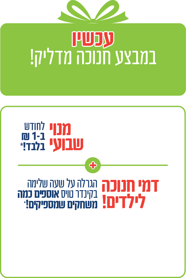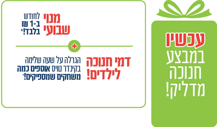 *בעלות דמי משלוח ע"ס 2.5 ש"ח לשבוע, המנוי ממשיך אוטומטית במחיר הרגיל ללא התחייבות, מבצע ההיכרות הוא למנויים חדשים בלבד- מי שלא היה מנוי בשנה האחרונה, התמונות להמחשה בלבד, בכפוף לתקנון, שווי הזכיה בסך 4,000 ש"ח ברשת קינדר טויס למימוש באתר או בחנות המבצע | למנויים חדשים בלבד | הזכיה למימוש בחנות